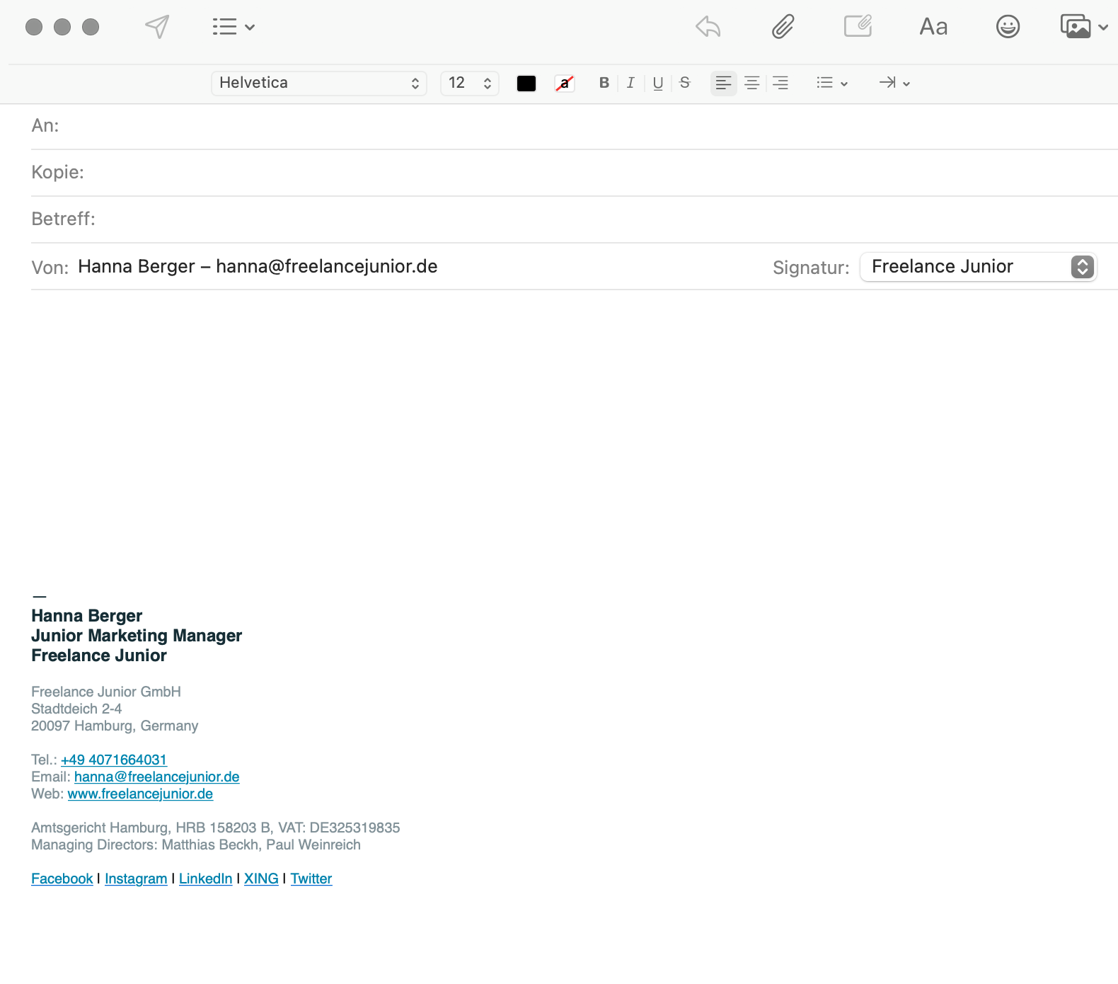Das heißt, es sollten auf jeden Fall dein Vor- und Nachname sowie eine Anschrift enthalten sein. Es gleicht sozusagen den Angaben deiner Anschrift auf einem Geschäftsbrief. Bist du ein:e Gesellschafter:in bürgerlichen Rechts, muss außerdem die Rechtsform bzw. die Abkürzung der Rechtsform mit in die E-Mail-Signatur. Auch die Konten deiner sozialen Medien können direkt verlinkt werden.