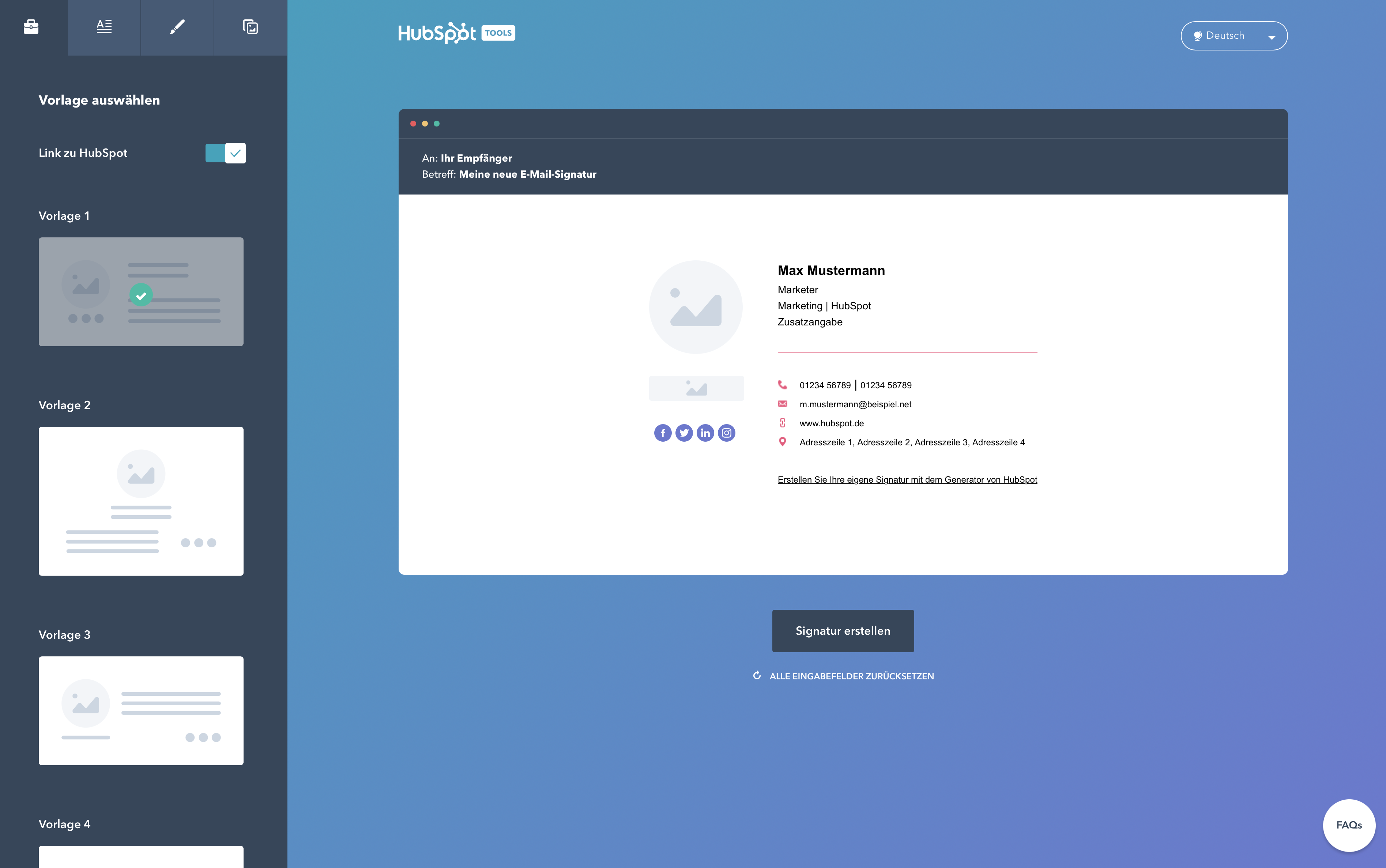 Mit HubSpot zum Beispiel kannst du aus verschiedenen Vorlagen auswählen und anschließend alle Eingaben für deine E-Mail-Signatur individuell generieren. Du kannst sogar dein eigenes Design erstellen, die Schriftart ändern, ein Profilbild und Unternehmenslogo einbauen oder einen Call-To-Action Button generieren, der direkt zu deiner eigenen Website führt. Du bleibst bei deinen Auftraggeber:innen mit einer professionellen E-Mail auf jeden Fall im Gedächtnis und kannst von vornherein überzeugen! 💪🏼