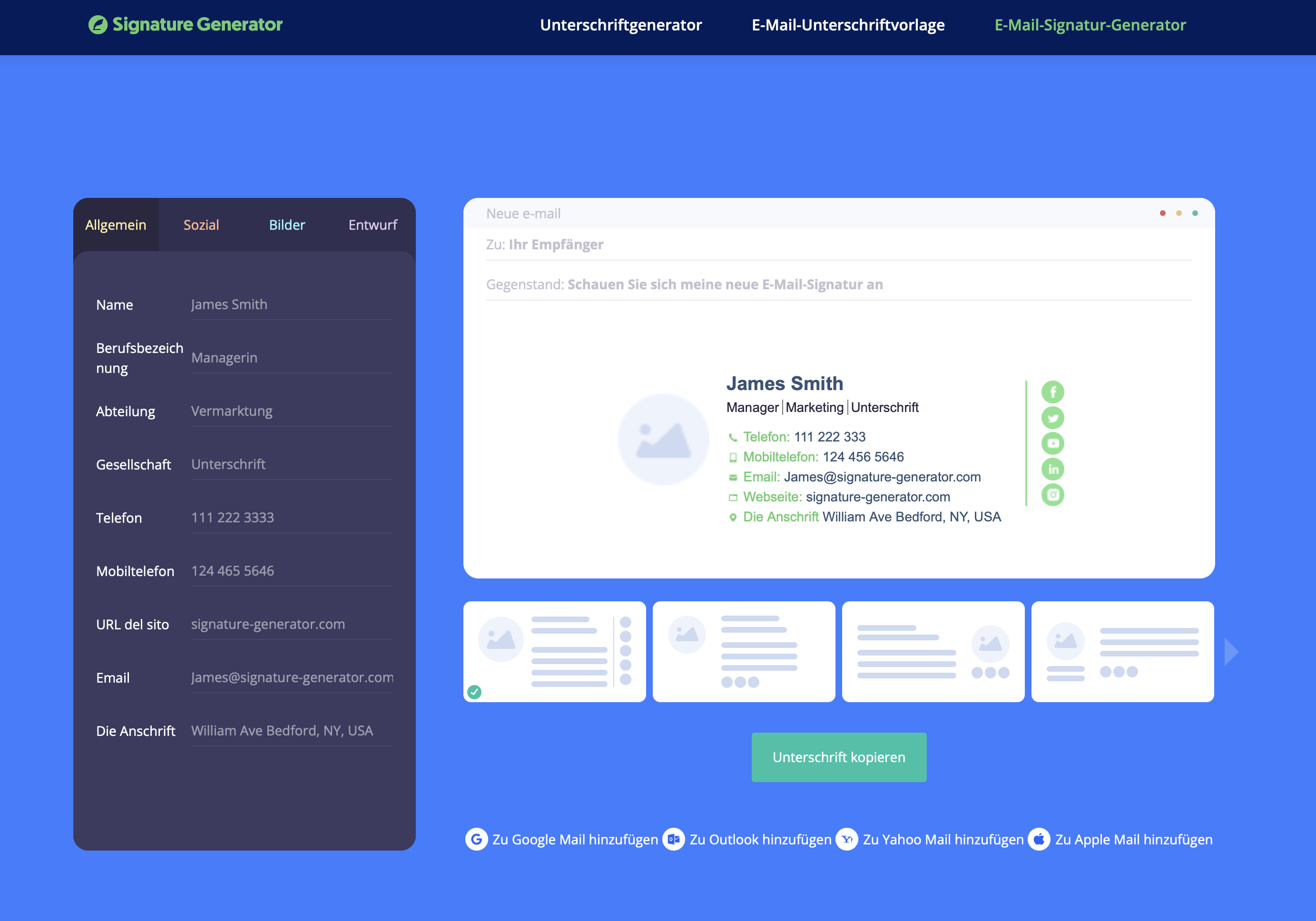 Ähnliche Möglichkeiten hast du bei SignatureGenerator. Auch hier kannst du aus unterschiedlichen Vorlagen wählen, deine Daten eintragen, soziale Medien direkt verlinken und ein Foto oder Logo hochladen. Klingt doch eigentlich super easy oder nicht? Der Aufwand ist auf jeden Fall nicht groß und lohnt sich zu 100 %!