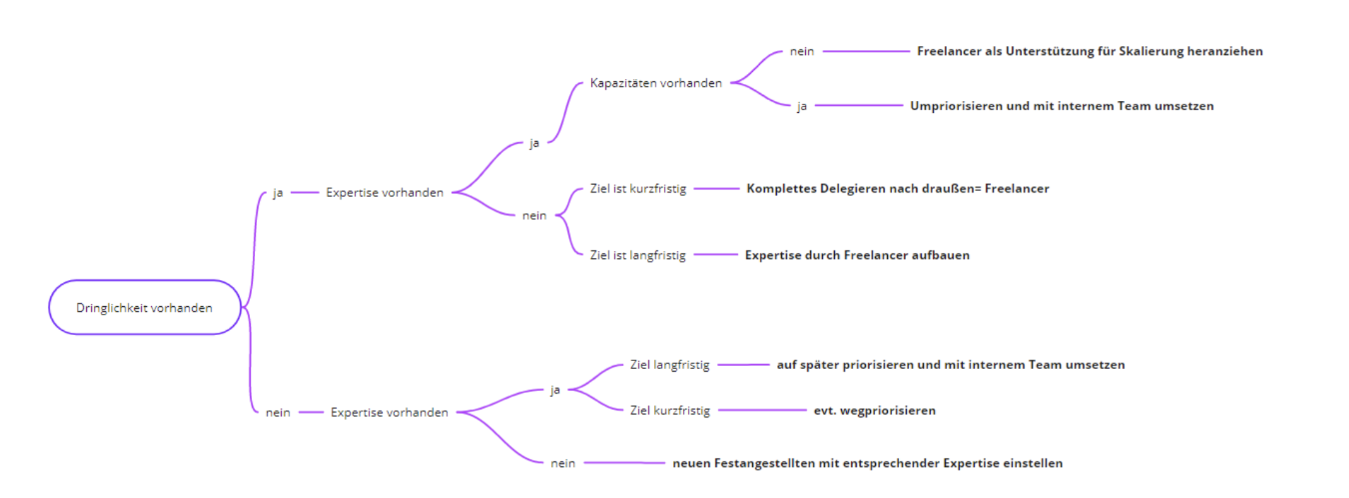 Oder ist das Gegenteil der Fall: Soll das Projekt gänzlich nach außen verlagert werden, weil es nicht zum eigenen Unternehmenskern passt? Besonders in diesem Fall, wenn das Projekt nicht in das eigene Unternehmen hineinpasst, bietet sich eine komplette Externalisierung an, d.h. das Projekt wird ganz nach draußen an Freiberufler:innen verlagert.