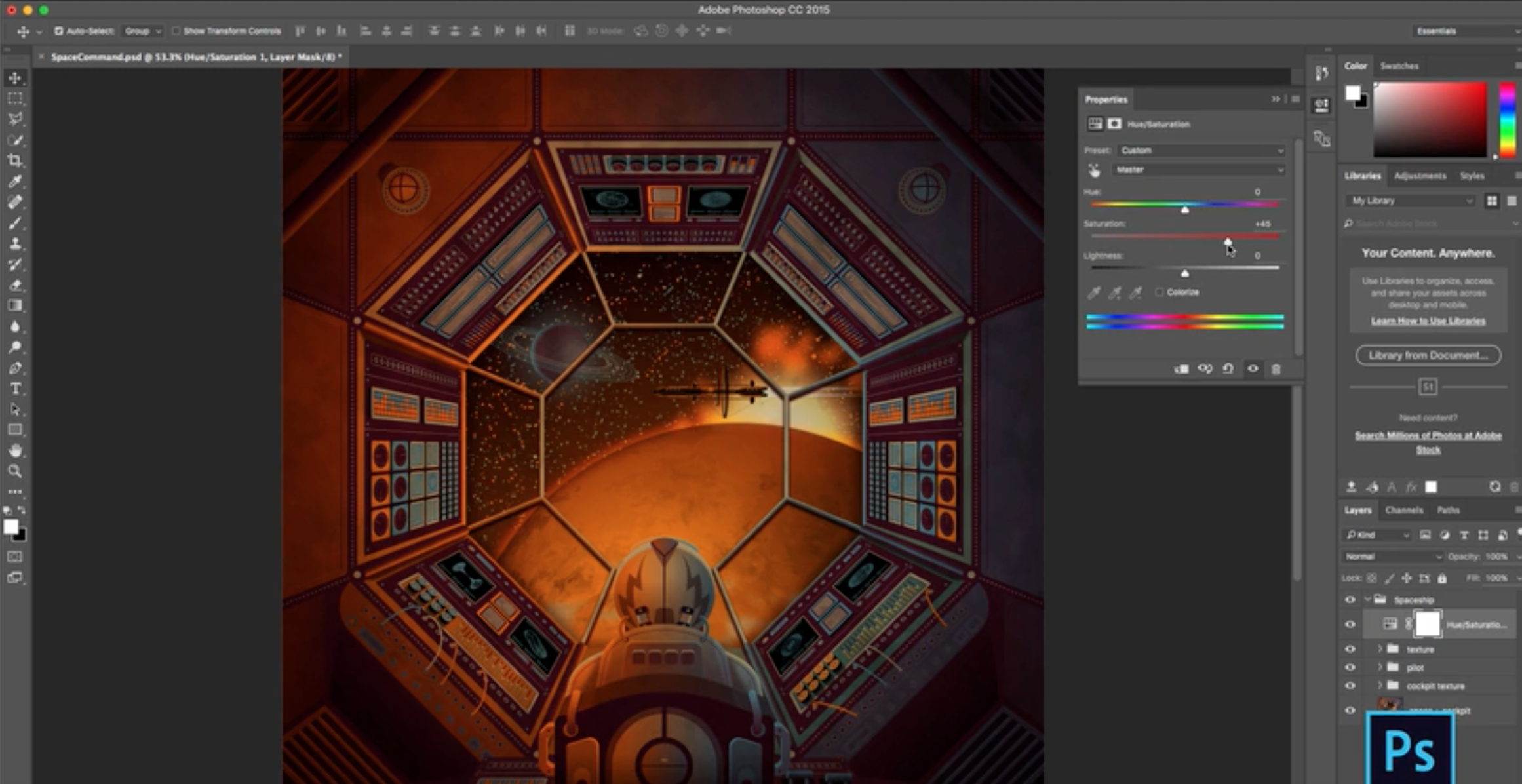Adobe Photoshop ist ein pixelbasiertes Programm. Im Grafikdesign kannst du hier also Bilder in Farbe und Belichtung ändern, Objekte bearbeiten oder entfernen und Ausschnitte aus verschiedenen Bildern zusammenfügen. Bilder können im RGB-Modus für Bildschirme oder im CMYK-Modus für Printprodukte verwendet werden. RGB steht hier für die Farben Rot, Grün und Blau und diese lassen sich als Monitorfarben bezeichnen, während CMYK beim Drucken für die Farben Cyan, Magenta, Gelb (Yellow) und die Key-Colour Schwarz verwendet werden. Natürlich sind die Funktionen noch viel weitreichender. Wenn du nun eine Vektordatei aus Adobe Illustrator einfügen möchtest, kannst du diese als Smart-Objekt einfügen oder aus der Mediathek einfach hereinziehen und beliebig skalieren.