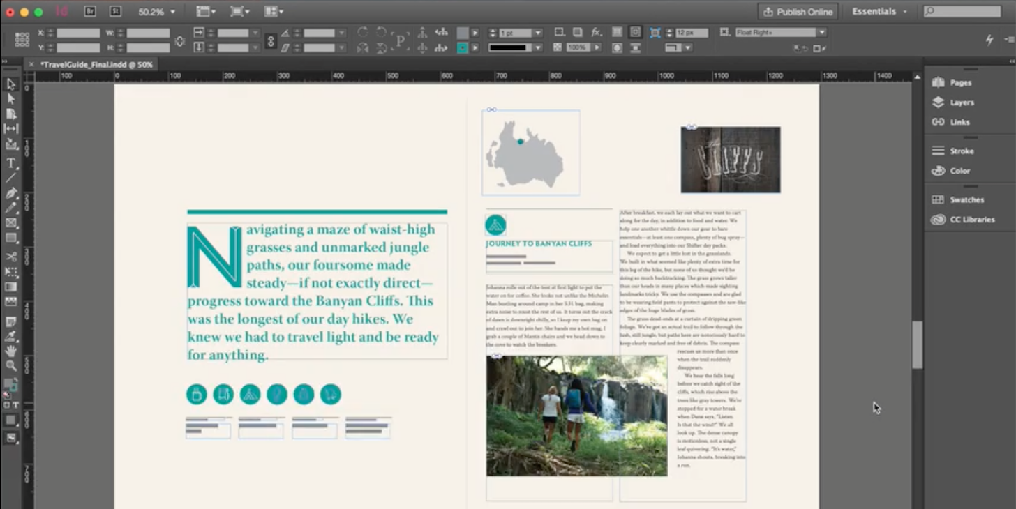 Mit den vielseitigen Werkzeugen lassen sich durch Raster- und Hilfslinien alle Elemente strukturiert platzieren. Die Texte können in beliebiger Form formatiert und durch sogenannte Musterseiten fest bestehende Objekte festgelegt werden. Für Anfänger sind Funktionen wie die Machine-Learning-Technologie von Vorteil, wobei das Layout beim Verschieben eines Objektes automatisch neu angeordnet wird. Adobe InDesign bietet außerdem die Möglichkeit, mit Templates zu arbeiten und vereinfacht somit die Suche nach einem geeignetem Layout.