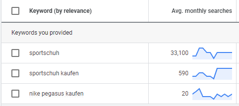 Verwendet dabei immer euer Fokus-Keyword, in dem Fall „Sportschuh“. Der Keyword-Planer geht nicht von allein davon aus, dass sich das einzelne Wort, wie zum Beispiel „Passform“ auf Sportschuh bezieht und prüft das Keyword ansonsten einzeln.