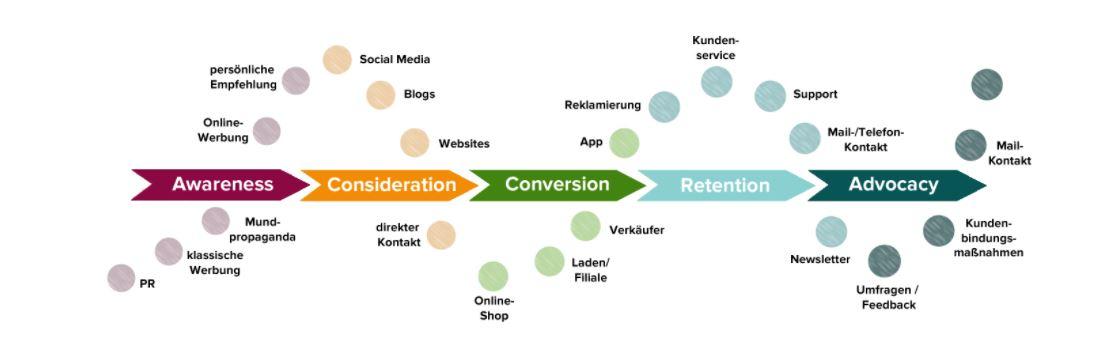 Die Customer-Journey wird in fünf Phasen eingeteilt: Awareness (Aufmerksamkeit), Consideration (Informationsbeschaffung), Conversion (Kaufentscheidung), Retention (Kundenerhalt) und Advocacy (Kundenbindung). Sie stellt damit eine Erweiterung des AIDA-Modells (Attention, Interest, Desire, Action) dar.