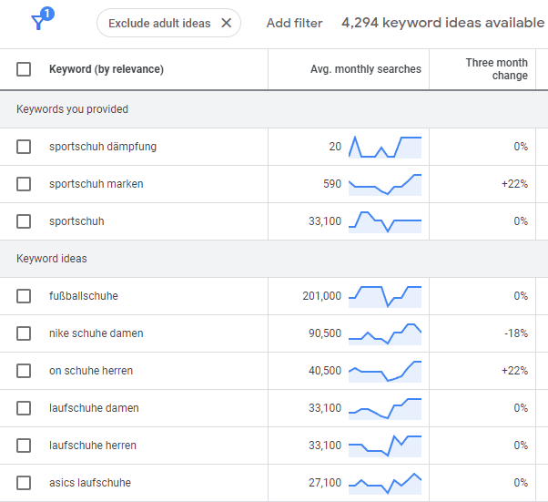 Für den Beginn ist der Keyword-Planer von Google jedoch ausreichend. Prinzipiell ist dieser kostenfrei, jedoch werden nur mit einer laufenden Ads-Kampagne sinnvoll nutzbare Suchvolumen angezeigt. Dafür reicht bereits ein kleines Budget aus. Ahrefs ist hingegen ein kostenpflichtiges Tool. In diesem Beispiel greife ich nur auf den Keyword-Planer von Google zurück. Wir bleiben bei unserem Ratgeber zu Sportschuhen und ich erläutere einmal das Vorgehen und die Gedankengänge an einzelnen Beispielen.