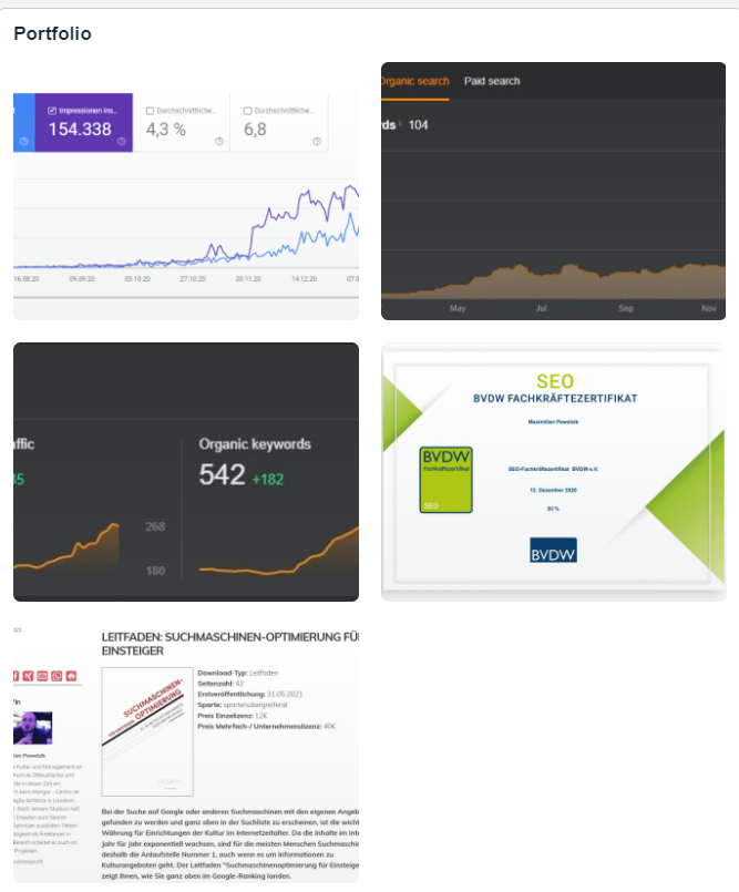 Das andere (Bild unten) Portfolio, welches wir beispielhaft vorstellen wollen, ist von Maximilian, einem weiteren Freelancer bei uns. Maximilian ist SEO-Manager, also bedient er eine ganz andere Branche als Alex. Nichtsdestotrotz hat auch Maximilian die Chance erkannt, sich durch sein persönliches Portfolio interessanter machen zu können. Maximilian hat zum Beispiel ein für seine Profession wichtiges Zertifikat hochgeladen, um von seinen Qualitäten zu überzeugen.