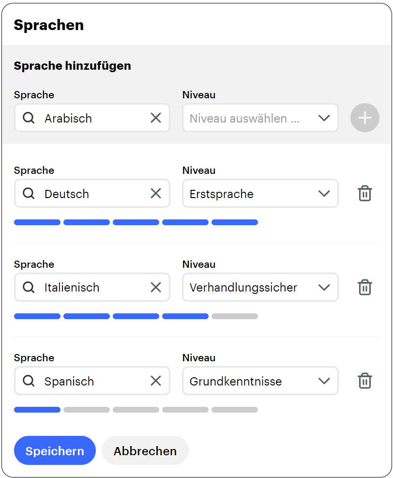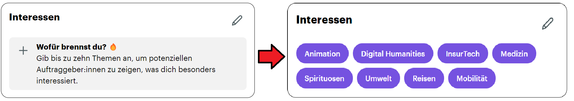 Mit der Angabe deiner Interessen kannst du deinem Profil eine ganz persönliche Note verleihen. Aus einem Groß an Auswahlmöglichkeiten kannst du dir bis zu zehn Interessen aussuchen und damit zeigen, dass du neben deinen beruflichen Fähigkeiten noch für weitere Leidenschaften brennst. Im Zweifelsfall untermauern deine Interessen gar deine beruflichen Fähigkeiten. So kannst du vorweisen, dass du liebst, was du tust. Dir fehlt ein Interessensgebiet? Dann schreib uns!