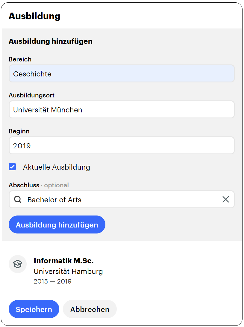 Füge deinen persönlichen Informationen deine Berufsausbildung oder dein Studium hinzu, damit die Auftraggeber:innen wissen, wo du stehst. Wenn du Zertifikate erworben hast, gib diese auch gerne mit an. Wenn du mehrere Sprachen sprichst, gib alle unbedingt an. Die globalisierte Welt, in der wir heute leben, ist ganzheitlich vernetzt und wir können mit Menschen über den ganzen Globus kommunizieren.