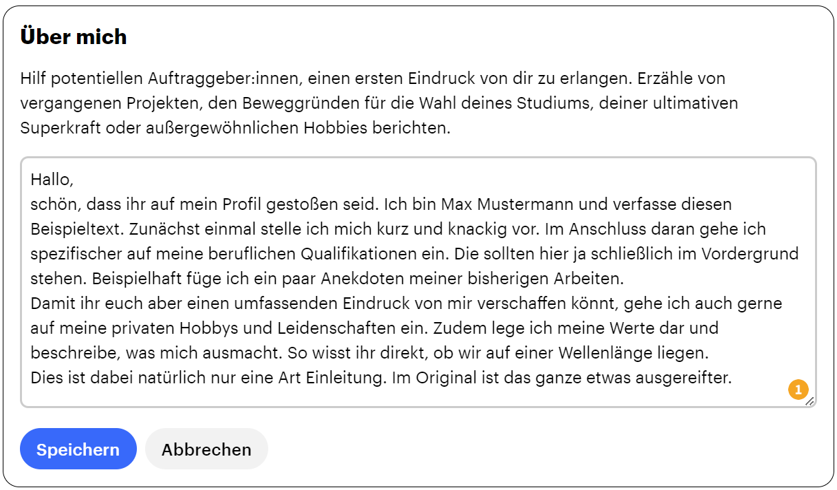 Hier kannst du einen kurzen Text verfassen, in dem du in ein paar Sätzen von dir überzeugen kannst. Dieser Teil ist sicherlich Kern deines Profils und für die Auftraggeber:innen besonders wichtig. Erzähle, was du bereits gemacht hast und halte deine persönlichen Informationen und deine Laufbahn immer auf dem neusten Stand. Es empfiehlt sich, hier auch etwas spezifischer zu werden. Erzähl auch gerne etwas Privates und geh detailliert auf deinen Werdegang ein.