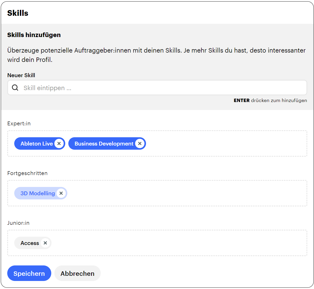 In die erste Kategorie trägst du all die Fähigkeiten ein, die du besonders gut beherrschst. Sei nicht schüchtern, sondern von dir selbst überzeugt. Die Kategorie „Fortgeschritten“ ist für Skills vorgesehen, die du mittelmäßig beherrschst. Führe ruhig alles auf, was dir so einfällt. Die Kategorie Grundkenntnisse ist tendenziell selbsterklärend. Aber auch hier gilt: trau dich Dinge aufzuführen, auch wenn du weißt, dass du in diesen Bereichen noch viel hinzulernen kannst. Sobald du deine Fähigkeiten ausbaust, kannst du sie natürlich ganz einfach per “Drag & drop” um eine Kategorie nach oben oder unten verschieben. Deine ausgefüllten Skills erhöhen die Wahrscheinlichkeit passend für potenzielle Auftraggeber:innen zu sein und machen dich interessant. Passender Skill nicht dabei? Dann schreib uns!