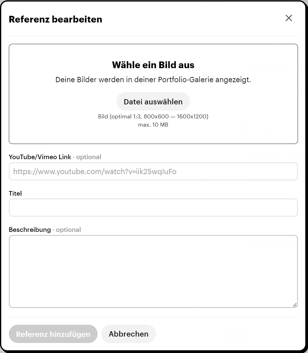 In deinem persönlichen Portfolio kannst du - ausschließlich - Bilddateien hochladen. Hier solltest du deine bisherigen Arbeiten präsentieren. Dies können bspw. ausgewählte Fotografien, Beispieltexte oder auch einfach nur Bilder von dir bei der Arbeit sein. Kreativität ist hier gefragt. Bist du zum Beispiel Webdesigner, kannst du Fotos von Websites hochladen, die du erstellt oder bearbeitet hast. Such dir Bilder raus, die den Auftraggeber:innen Lust auf dich als Freelancer:in machen. Die Bilder kannst du mit einem passenden Titel und einer entsprechenden Beschreibung versehen (siehe Bild). Die Auftraggeber:innen können so direkt checken, ob du und dein Style zu ihnen passt. Nutze diese Chance, um zu zeigen, was du kannst! Wenn ihr eure Vorschläge bereits versendet habt und die Auftraggeber:innen euch als “interessant” einstufen, könnt ihr natürlich auch eure kompletten Referenzen wie bspw. Videos, Programme, Texte usw. versenden. Das Portfolio dient dazu einen ersten Eindruck ebendieser Referenzen zu gewährleisten. Es ist quasi nur ein Vorgeschmack für das, was danach kommt.