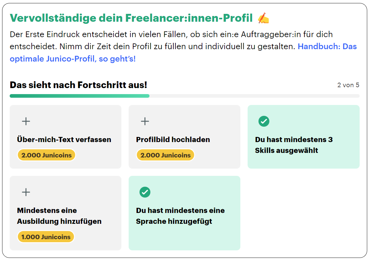 Wir versuchen dir die Profilerstellung so leicht wie möglich zu machen. Aus diesem Grund sollte in deinem Profil stets ein Kasten erscheinen, der deinen Profilstatus kommentiert und dir angibt, welche Dinge du zu einem guten Profil noch zu erledigen hast. Dabei werden jedoch nur die Grundlagen abgebildet (siehe Bild unten). Willst du das perfekte Profil, solltest du die Hinweise aus diesem Artikel befolgen. Dein Profil sollte aber mindestens den Status “Dein Profil lässt sich sehen” erhalten. Alles, was darüber hinaus geht, ist natürlich noch besser. Außerrdem erscheint unter deinem Namen ein kleiner blauer Haken, wenn du das Onboarding absolviert hast. So wissen Auftraggeber:innen, dass du persönlichen Kontakt zu Junico hattest und ein geschätzter Teil unserer Community bist.