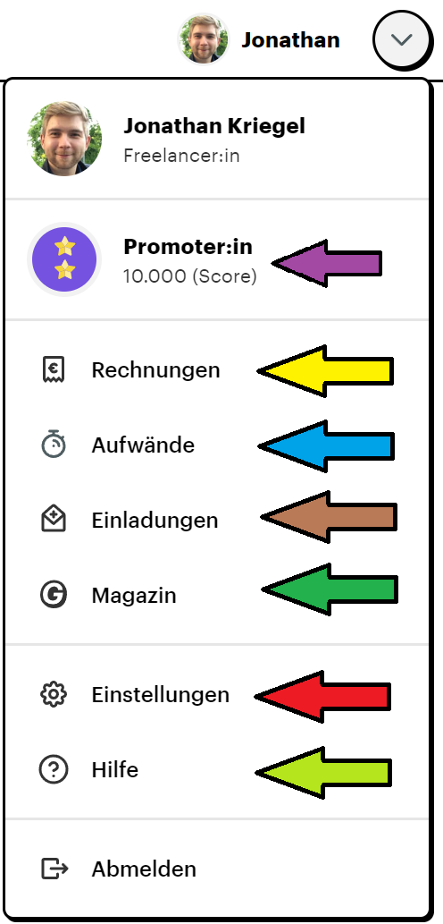 Neben deinem Namen findest du ein Dropdown Menü. Hier stehen dir verschiedene Aspekte zur Auswahl: