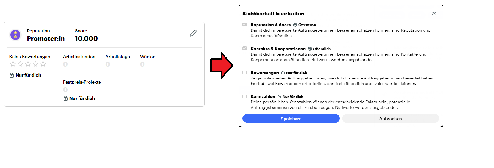 Du hast in diesem Feld auch die Möglichkeit weitere Sachen öffentlich anzeigen zu lassen. Alternativ kannst du sie auf "privat" stellen, sodass sie nur für dich sichtbar sind. Einerseits kannst du hier nämlich die Bewertungen von bisherigen Auftraggeber:innen anzeigen lassen. Mit guten Bewertungen hebst du dich logischerweise von anderen ab. Außerdem kannst du potenziellen Auftraggeber:innen anzeigen, wie viel Arbeit du schon über Junico geleistet hast: Arbeitsstunden, Arrbeitstage, Wörter und Festpreis-Projekte stehen dir hier zur Auswahl. Je nachdem in welcher Branche du tätig bist, sollte hier was für dich dabei sein. Als Texter:in könnte die Wortanzahl hier bspw. recht hoch liegen, während bei Entwickler:innen eventuell die Festpreis-Projekte einen höheren Wert aufweisen.
