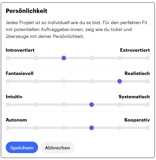 Deine Interessen heben deine Persönlichkeit nicht genug hervor? Unter Persönlichkeit kannst du vier persönliche Merkmale zusätzlich skalieren: