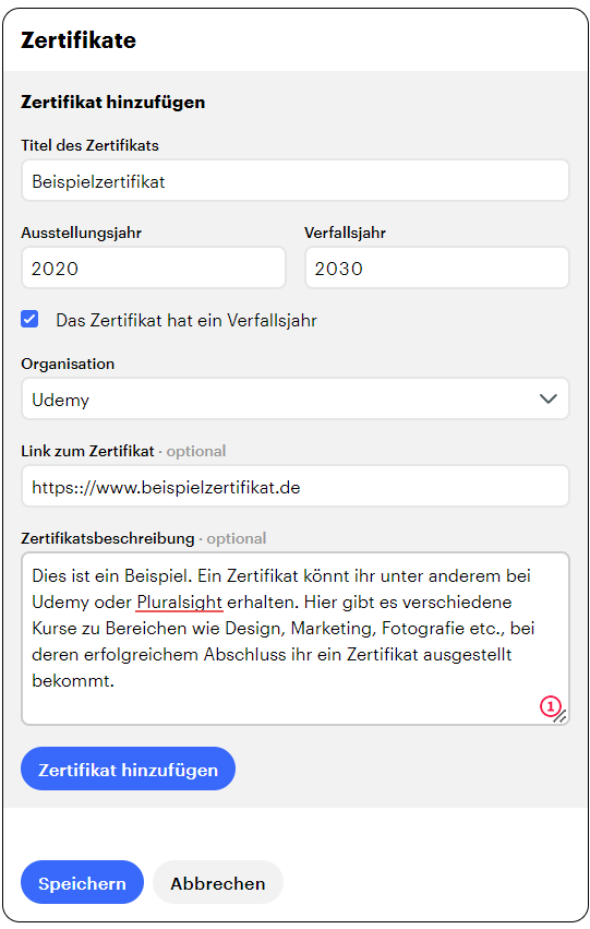 Deine beruflichen Qualifikationen kannst du zusätzlich durch erworbene Zertifikate untermauern oder ergänzen. Du kannst deine Fähigkeiten natürlich auch ohne jahrelange Ausbildung erweitern und das sollst du schließlich auch präsentieren können. Auf Plattformen wie Simplyfree, Udemy oder Pluralsight kannst du entsprechende Zertifikate erwerben.