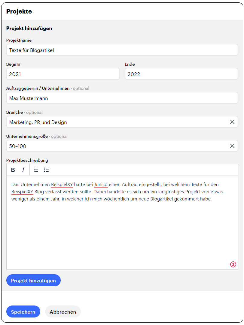 Für einige von euch dürfte es schwieriger sein, ein aussagekräftiges Portfolio zu erstellen. Wenn ihr bspw. vorrangig mit Texten arbeitet, könnt ihr diese natürlich auch im Portfolio abbilden, doch vielleicht gebt ihr diese auch lieber als Gesamtprojekt an. Dies ist unter genau diesem Punkt möglich. Hier kannst du vergangene Projekte angeben und so zeigen, was du bereits alles geleistet hast. Dabei muss es sich auch nicht zwangsläufig um ein Projekt während deiner Zeit als Freelancer:in handeln. Für die Auftraggeber:innen ist es im Zweifel auch interessant zu sehen, in welchen Größenordnungen du bereits gearbeitet hast. Warst du bspw. bereits in einem großen Unternehmen an einem Projekt beteiligt - dann rein in diese Kategorie. Dies zeigt, dass du kooperativ arbeiten kannst und mit gewissen bürokratischen Gegebenheiten umzugehen weißt.