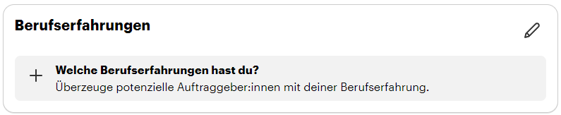 Alternativ oder ergänzend zum Portfolio kannst du auch angeben, welche Berufserfahrungen du in deiner Karriere schon sammeln konntest. Hier kannst du natürlch sowohl deine Freelancer:innen-Tätigkeiten als auch Festanstellung als Arbeitnehmer:in aufführen. Quasi wie in deinem Lebenslauf gibst du hier also an, wo du wie lange für wen als was gearbeitet hast. Potenziellen Kund:innen kannst du so noch besser zeigen, dass du die nötige Expertise mitbringst!