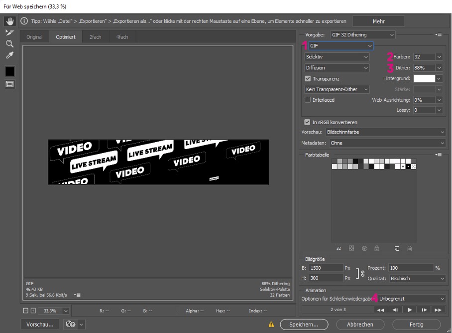 Hier legst du fest, wie viele Farben dein GIF haben kann. Je mehr Farben möglich sein sollen, desto größer wird der Speicherbedarf. Da du das GIF auf deinem Profil einbinden möchtest, empfehle ich, die Größe unter 100-200KB zu halten, da du dadurch die Ladezeit der Website verlangsamen könntest. Du wirst feststellen, bei schwarz/weiß Animationen reichen wenige Farben aus und man erhält scharfe Kanten. Bei bunten Animationen stößt du recht schnell an eine Grenze. Deswegen einfach und minimalistisch halten! Keine Sorge, wenn unschöne Farbsäume entstehen, das kann Schritt 3 beheben.